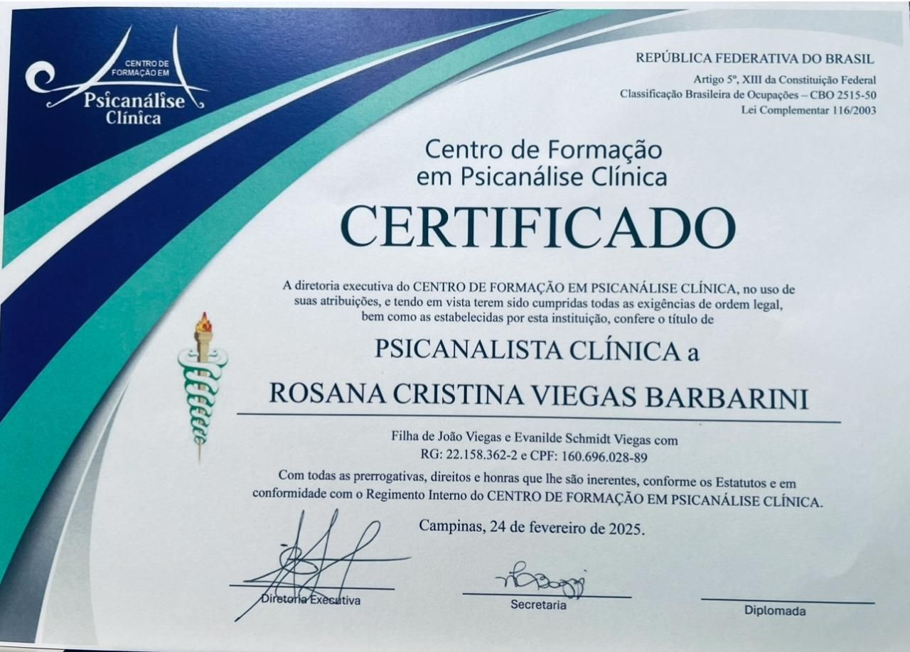 PSICANALISTA ESPECIALISTA em PREVENÇÃO ao SUICÍDIO e DESENVOLVIMENTO de CARREIRA. Atendimento online para brasileiros que vivem no Brasil e no exterior, e também para outros latinos que vivem no exterior (por meio do Programa Latinos pelo Mundo). Sou Rosana Viegas, psicanalista clínica e mentora especializada em ajudar pessoas a encontrarem clareza, propósito e equilíbrio em suas vidas e carreiras. Minha missão é acolher, escutar sem julgamentos e conduzir indivíduos em um processo profundo de autoconhecimento, ajudando-os a superar inseguranças, ansiedades e bloqueios emocionais que impedem seu crescimento. Habilidades para trabalhar com pacientes depressivos em vias de tentativas de suicídio. Com mais de 30 anos de experiência no mundo corporativo e no empreendedorismo lidando com pessoas, compreendo os desafios emocionais e profissionais que podem surgir ao longo da vida. A insatisfação, a dúvida e o medo de errar são sentimentos comuns, mas não precisam ser definitivos. Por meios da Psicanálise Clínica Moderna, ajudo meus pacientes a entenderem suas emoções, a se libertarem de padrões limitantes e a construírem um caminho mais alinhado ao que realmente desejam. Além da psicanálise, desenvolvi métodos exclusivos de mentoria para auxiliar pessoas que se sentem perdidas em sua trajetória profissional. Meu trabalho é voltado especialmente para: - Quem está em sofrimento emocional, mental e físico. - Jovens indecisos, que buscam um propósito e querem tomar decisões mais seguras sobre o futuro. - Recém-formados, que enfrentam incertezas no início da carreira e querem um direcionamento claro. - Profissionais insatisfeitos, que desejam mudança, mas sentem medo ou não sabem por onde começar. Minha abordagem é fundamentada em ciência e experiência com um olhar humanizado. Acredito que cada pessoa tem um potencial único e que, muitas vezes, tudo o que falta é o entendimento profundo de si mesma para transformar dúvidas em decisões e desafios em crescimento. Se você sente que precisa de mais clareza e equilíbrio em sua vida PESSOAL E PROFISSIONAL, estou aqui para ajudar com bastante vontade. Vamos juntos nessa jornada? -> MEUS WEBSITES: WWW.ROSANAVIEGAS.COM.BR e WWW.PSICANALISTA-ROSANAVIEGAS.COM.